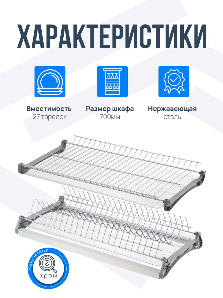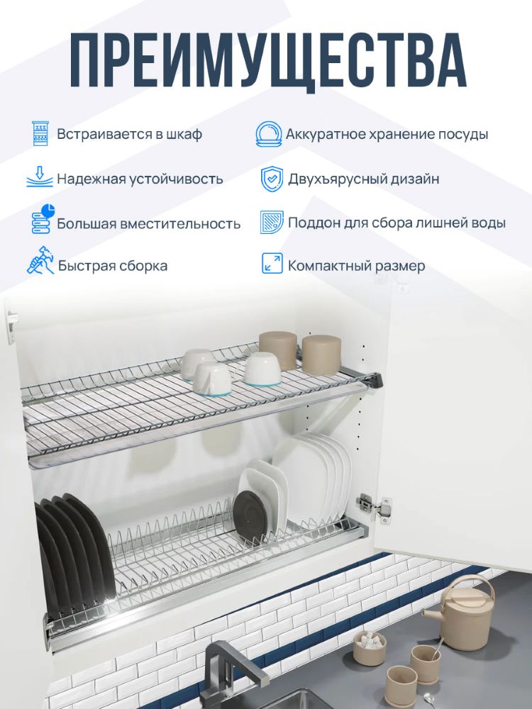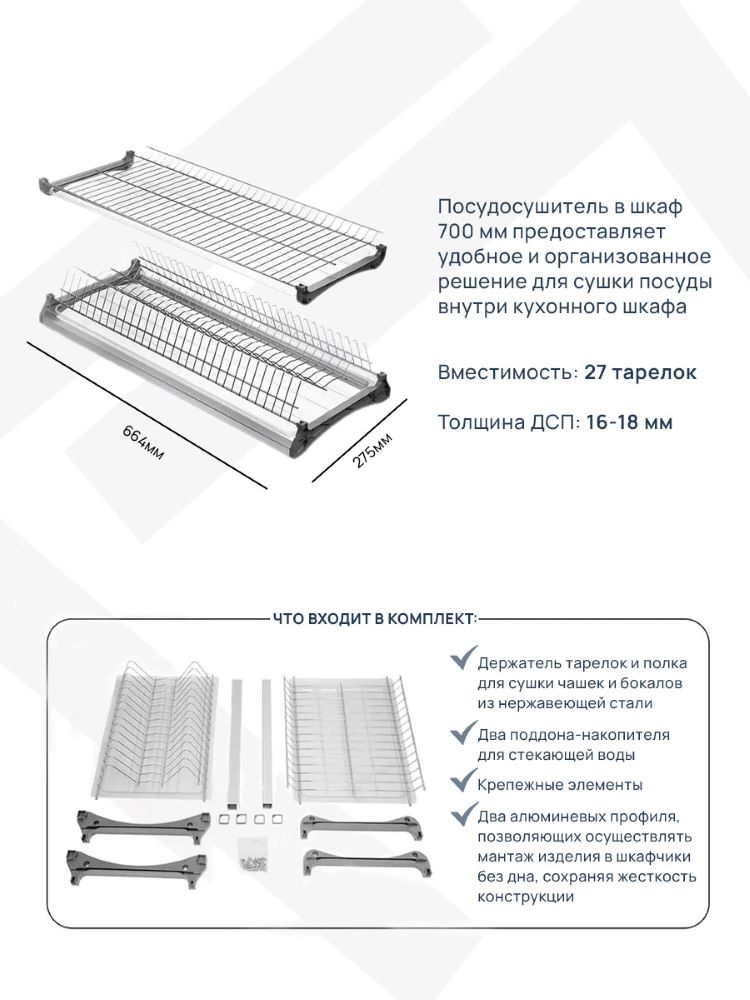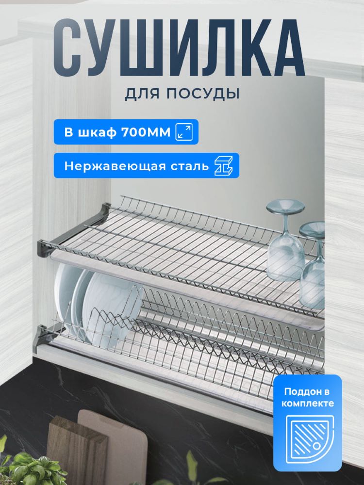 Двухуровневая встраиваемая сушилка для посуды. Предназначена для монтажа в верхний шкафчик кухонного гарнитура. В комплект входят: держатель тарелок и полка для сушки чашек и бокалов ИЗ НЕРЖАВЕЮЩЕЙ СТАЛИ, два поддона-накопителя для стекающей воды, крепежные элементы и два алюминиевых профиля, позволяющих осуществлять монтаж изделия в шкафчики без дна, сохраняя жесткость конструкции.